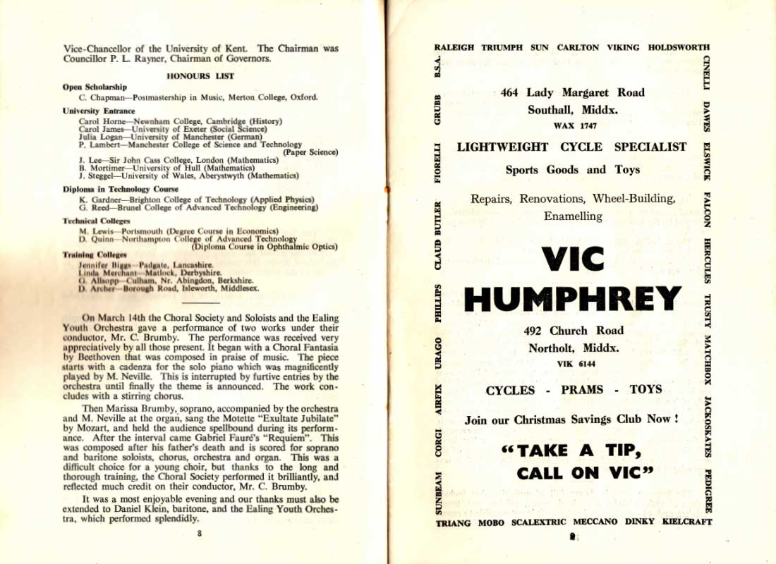On March 14th the Choral Society and Soloists and the Ealing Youth Orchestra gave a performance of two works under their conductor, Mr. C. Brumby. The performance was received very appreciatively by all those present. It began with a Choral Fantasia by Beethoven that was composed in praise of music. The piece starts with a cadenza for the solo piano which was magnificently played by M. Neville. This is interrupted by furtive entries by the orchestra until finally the theme is announced. The work concludes with a stirring chorus.