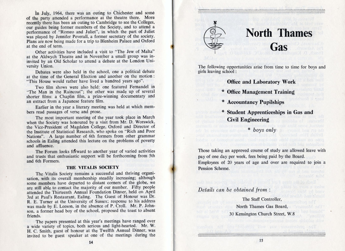 The activities of the Vitalis Society have continued with unabated vigour this year, as is shown by the wide variety of papers presented by Staff and Sixth-Form speakers. They have included "The Science of Dreams", "The Ku Klux Klan", "Surrealism", "Galileo and the Two Systems of the World", "The Psychology of Humour", and "A Lesson for the Aspiring Social Climber". We are indebted to Miss Strickley for her hospitality, and also to Mr. Alderman and Mr. Roberts for their continuing participation in the Society.