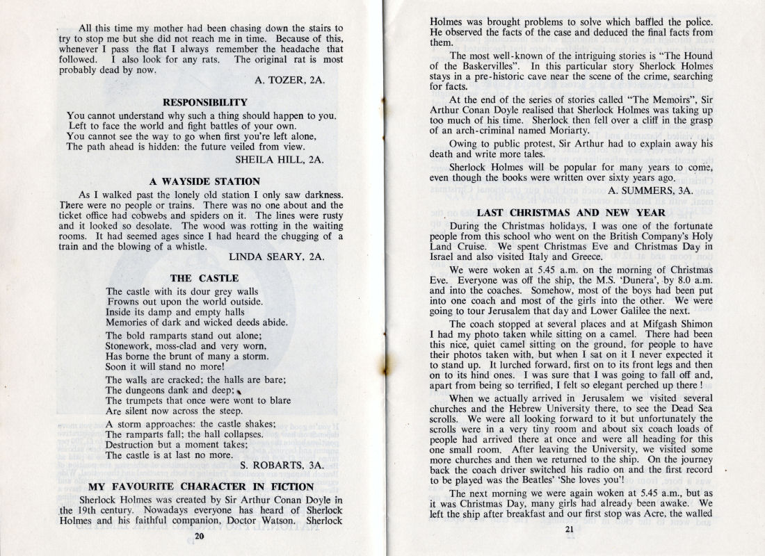 p20 A FUNNY INCIDENT A. TOZER, 2A. RESPONSIBILITY SHEILA HILL, 2A. A WAYSIDE STATION LINDA SEARY, 2A. THE CASTLE S. ROBARTS, 3A. p21 MY FAVOURITE CHARACTER IN FICTION A. SUMMERS, 3A.