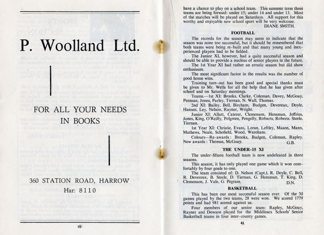 Junior XI: Allatt, Caterer, Clemenson, Hensman, Jeffries, Jones, King, O'Reilly, Polgreen, Pengelly, Robarts, Roberts, Steele, Tiernan.