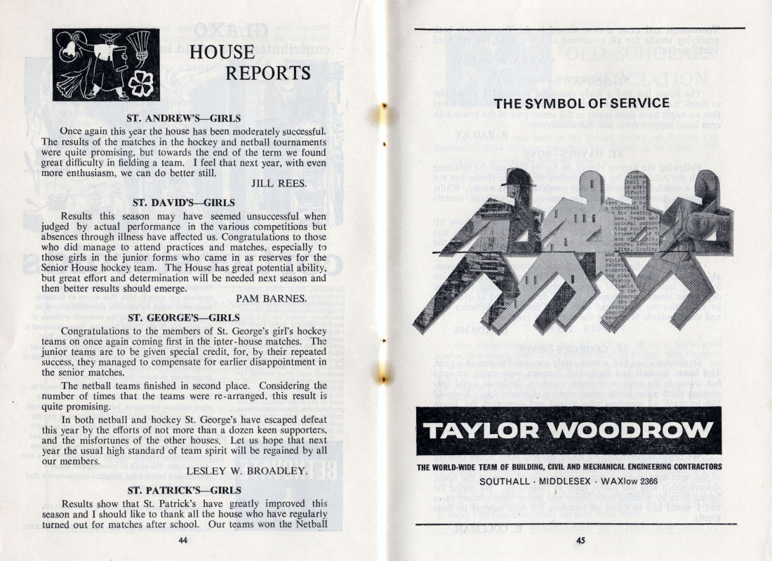 Once again this year the house has been moderately successful. The results of the matches in the hockey and netball tournaments were quite promising, but towards the end of the term we found great difficulty in fielding a team. I feel that next year, with even more enthusiasm, we can do better still.