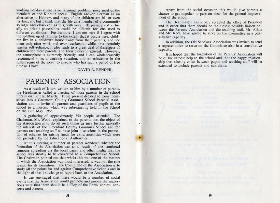 As a result of letters written to him by a number of parents, the Headmaster called a meeting of those parents in the school library on the 31st March. Those present decided to form them selves into a Greenford County Grammar School Parents' Asso ciation and to invite all parents and guardians of pupils at the school to a meeting which was subsequently held in the School on the 12th May. 1965.