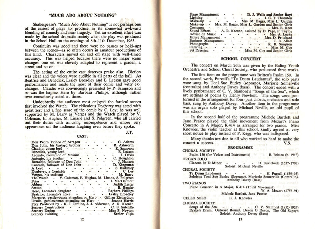 The first item on the programme was Britten's Psalm 150. In the second work, Purcell's "Te Deum Laudamus", the solo parts were sung by Toni Sue Burley (soprano), Marjorie Somerville (contralto) and Anthony Davey (bass). The concert ended with a lively performance of C. V. Stanford's "Songs of the Sea", which are settings of poems by Henry Newbolt. The songs were performed in the arrangement for four-part chorus, orchestra and solo bass, sung by Anthony Davey. Another item in the programme was an organ solo played by Michael Neville, an old pupil of this school.
