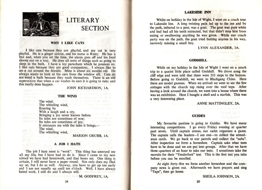 My favourite pastime is going to Guides. We have many interesting competitions. I go every Friday evening at quarter past seven. Until captain comes, our cadet organises a game. The captain calls the leaders I am one to collect the attendance cards. We go back to our patrols and collect the "subs". After inspection we form a horseshoe. Captain asks what tests have to be done and we are put into groups. After that we have three-quarters of an hour to take our tests. I sometimes take the recruits for their "Tenderfoot" test- This is the first test you take before you can be enrolled.