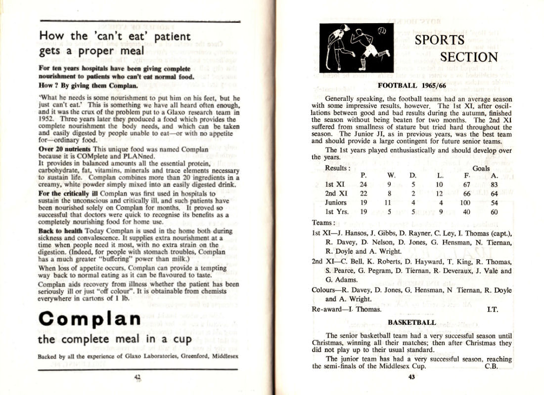 Generally speaking, the football teams had an average season with some impressive results, however. The 1st XI, after oscillations between good and bad results during the autumn, finished the season without being beaten for two months. The 2nd XI suffered from smallness of stature but tried hard throughout the season. The lunior II, as in previous years, was the best team and should provide a large contingent for future senior teams.