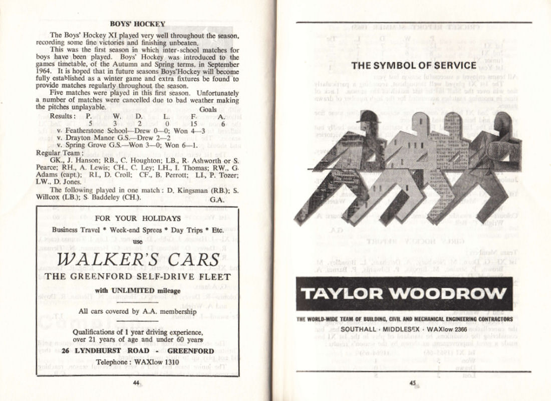 This was the first season in which inter-school matches for boys have been played. Boys' Hockey was introduced to the games timetable, of the Autumn and Spring terms, in September 1964. It is hoped that in future seasons Boys'Hockey will become fully established as a winter game and extra fixtures be found to provide matches regularly throughout the season.