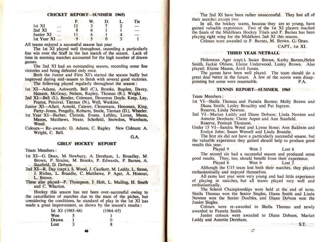 1st VI Sheila Thomas and Pamela Barnes; Molly Brown and Diana Smith; Lesley Broadley and Pat Ingram. Reserve, Linda Newton. 2nd VI Marian Leddy and Diane Dobson; Linda Newton and Annette Dereham; Claire Aspen and Ann Stanfield. Reserve, Peninah Thomson. Under 15 VI Sandra Wood and Lynne Stone; Ann Baldwin and Evelyn John; Susan Wensell and Linda Brandie. The first six did not have a particularly successful season, but the valuable experience they gained should help to produce good results this year.