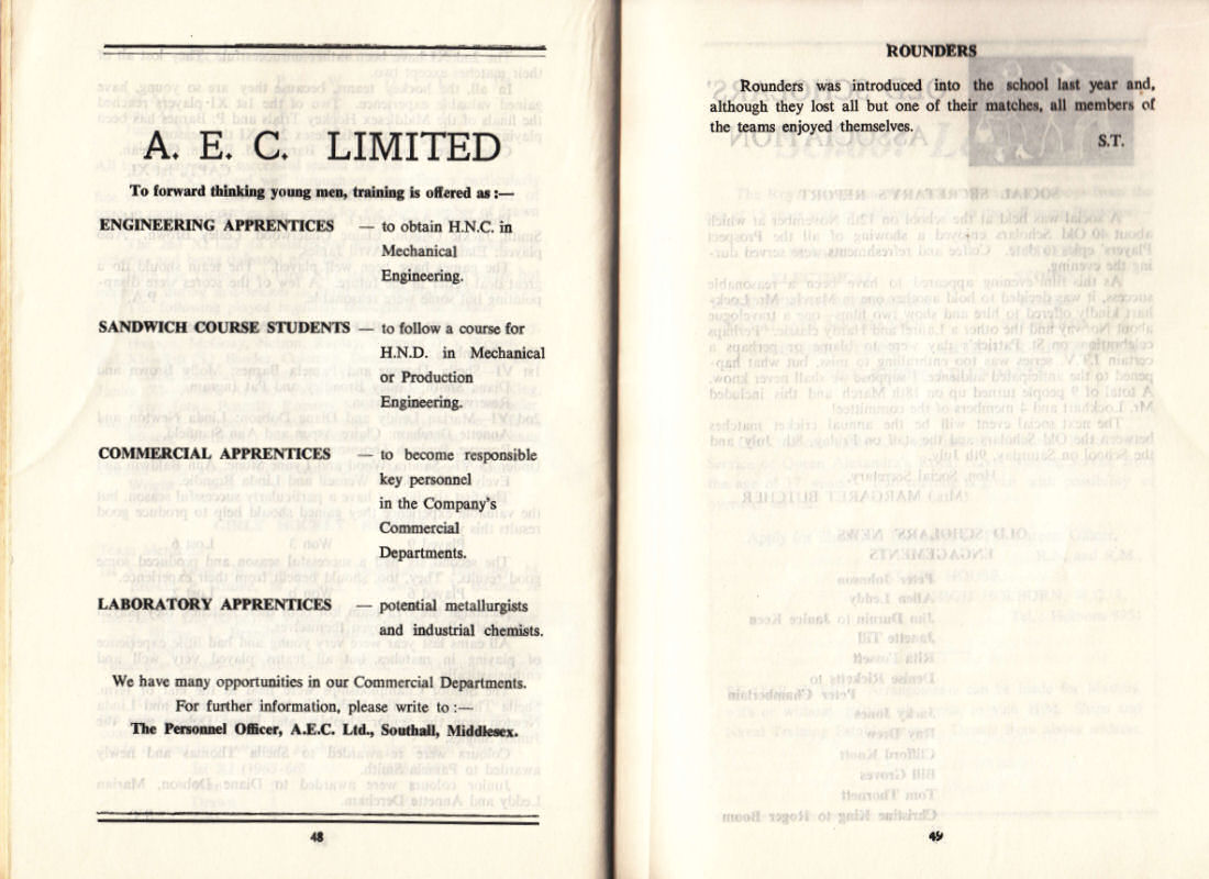 A.E.C. Ltd., Southall, Middlesex. 48 ROUNDERS Rounders was introduced into the school lant year and. although they lost all but one of their matches, all members of the teams enjoyed themselves. S.T. 49