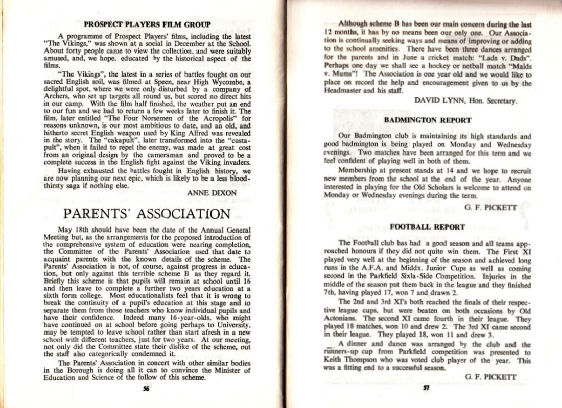 May 18th should have been the date of the Annual General Meeting but, as the arrangements for the proposed introduction of the comprehensive system of education were nearing completion, the Committee of the Parents' Association used that date to acquaint parents with the known details of the scheme. The Parents' Association is not, of course, against progress in education, but only against this terrible scheme B as they regard it. Briefly this scheme is that pupils will remain at school until 16 and then leave to complete a further two years education at a sixth form college. Most educationalists feel that it is wrong to break the continuity of a pupil's education at this stage and to separate them from those teachers who know individual pupils and have their confidence. Indeed many 16-year-olds, who might have continued on at school before going perhaps to University, may be tempted to leave school rather than start afresh in a new school with different teachers, just for two years. At our meeting, not only did the Committee state their dislike of the scheme, out the staff also categorically condemned it.