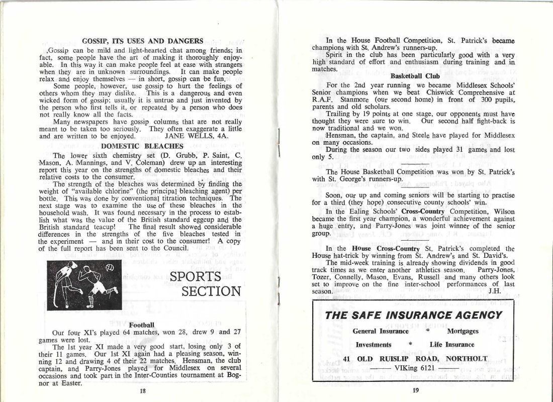 The lower sixth chemistry set (D. Grubb, P. Saint, C. Mason, A. Mannings, and V. Coleman) drew up an interesting report this year on the strengths of domestic bleaches and their relative costs to the consumer.