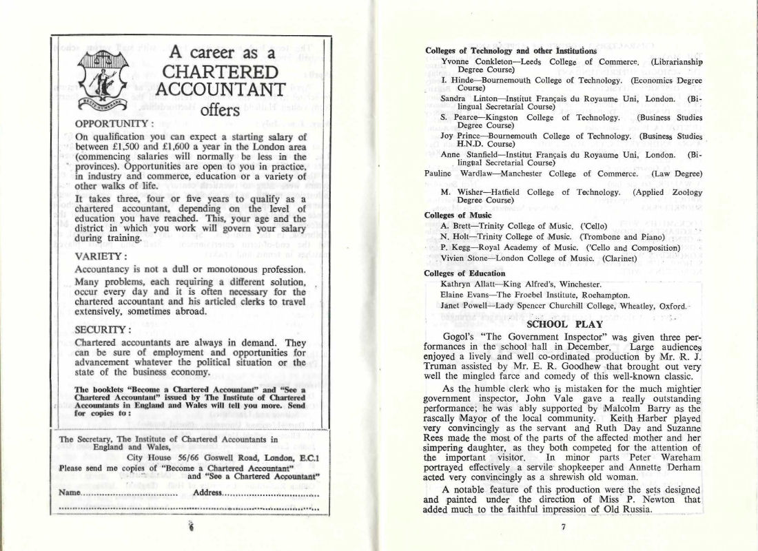 Gogol's The Government Inspector was given three performances in the school hall in December. Large audiences enjoyed a lively and well co-ordinated production by Mr. R. J. Truman assisted by Mr. E. R. Goodhew that brought out very well the mingled farce and comedy of this well-known classic.