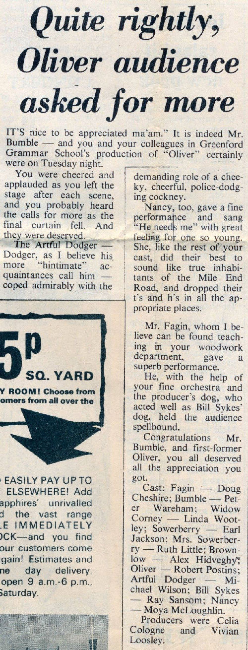 'Buster' meets the rest of the cast. The producer, Miss Vivian Loosley, introduces her own dog, Buster, to Robert Postins, who played Oliver, in the Greenford County Grammar School production of 'Oliver!' which was presented in the school on Tuesday, Wednesday and Thursday. Buster took the part of Bill Sykes dog