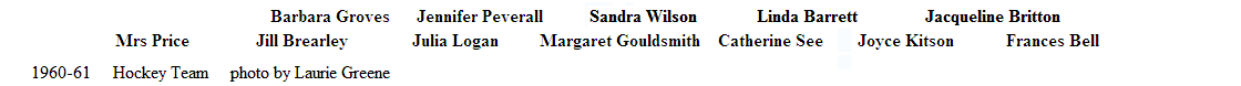 Sandra Wilson, Jacqueline Britton, Barbara Groves, Catherine See, Frances Bell, Jennifer Peverall, Jill Brearley, Joyce Kitson, Julia Logan, Linda Barrett, Margaret Gouldsmith, Mrs Price