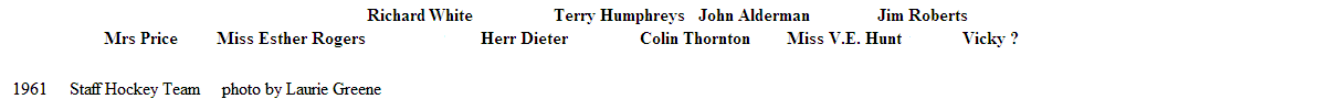 Colin Thornton, Herr Dieter, Jim Roberts, John Alderman, Miss Esther Rogers, Miss V.E. Hunt, Mrs Price, Richard White, Terry Humphreys photo by Laurie Greene